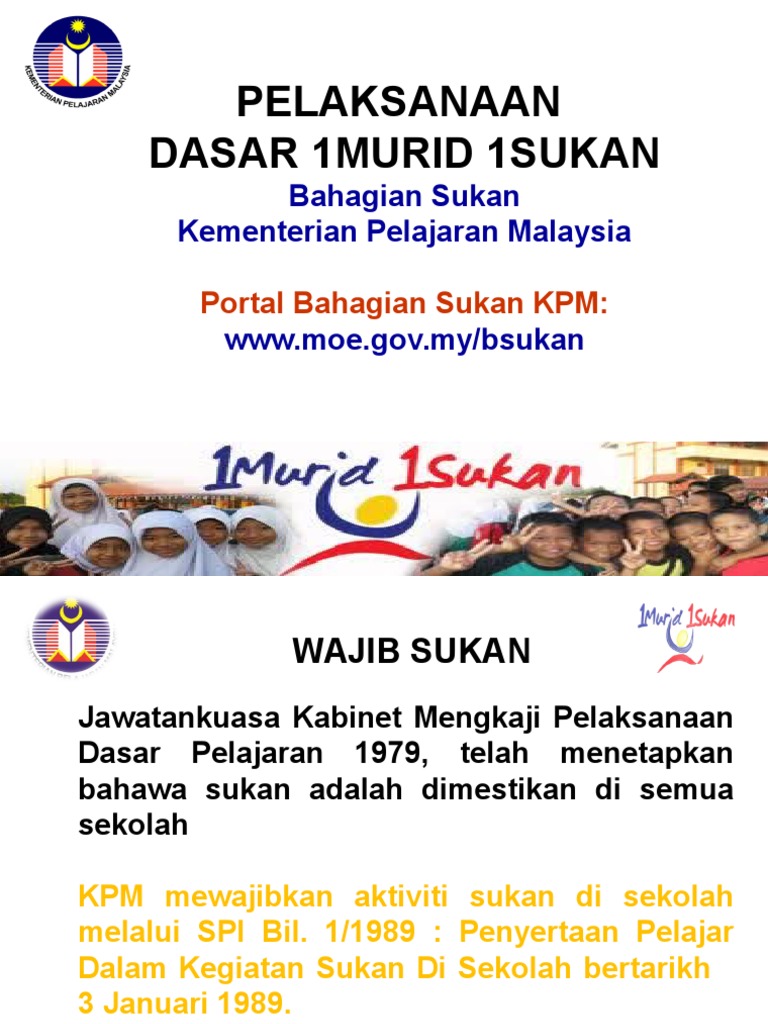 Dasar 1m 1s dapat memberi peluang secara menyeluruh kepada semua murid melibatkan diri dalam sukan secara lebih terurus dan terancang serta mengimbangkan fokus atau penekanan dalam melahirkan modal insan. Posted by sk btho 2. Lirik lagu 1 murid 1 sukan. Ipg kampus tun hussein on sebuah institut pendidikan guru yang tidak ketinggalan melaksanakan program larian serentak i murid 1 sukan i malaysia. Dasar 1 murid 1 sukan menekankan penglibatan setiap murid dalam sukan.