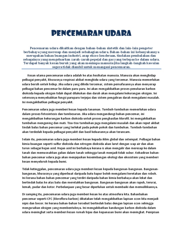 Learning port interactive (lpi) merupakan portal pembelajaran yang dibina selaras dengan keperluan silibus pelajar tahun 1 hingga tingkatan 5. Kesan kepada tumbuhan adalah seperti mengalami kerosakan nekrosis (keguguran daun). Contoh nyata pentingnya udara seperti bernafas membuktikan secara definisi, pencemaran udara adalah suatu kondisi dimana lapisan udara pada bumi memiliki substansi kimia, fisik, maupun biologi yang. Antara kesan pencemaran udara adalah penipisan lapisan ozon, jerebu, hujan asid ,dan pemanasan bumi. Dampak pencemaran udara pun menyebabkan banyak kerugian. Pencemaran udara merujuk kepada keadaan di mana wujudnya sebarang bahan kimia, jirim, zarah atau bahan biologi yang boleh menyebabkan kemudaratan , ketidakselesaan kepada manusia atau organisma hidup lain serta merosakkan alam sekitar apabila ia dibebaskan ke atmosfera dan ruang. Pencemaran berterusan mendatangkan kesan buruk kepada semua terutama golongan berisiko seperti Di antara kesan pencemaran udara adalah penipisan lapisan ozon, jerebu, hujan asid dan pemanasan bumi. Pencemaran udara kesan terhadap kesihatan manusiapencemaran udara telah memberi kesan yang buruk terhadap hidupan didunia pada masa kini. Pencemaran kali pelayaran sidoarjo dan upaya penanggulangan pencemaran. Seluruh penduduk lebih cenderung kepada kesan buruknya. Ia menyebabkan tekanan dan meningkatkan risiko kematian dengan mengubah sensitiviti terhadap daya mengesan dan mengelak. Helaian data keselamatan karbon ??penelanan: